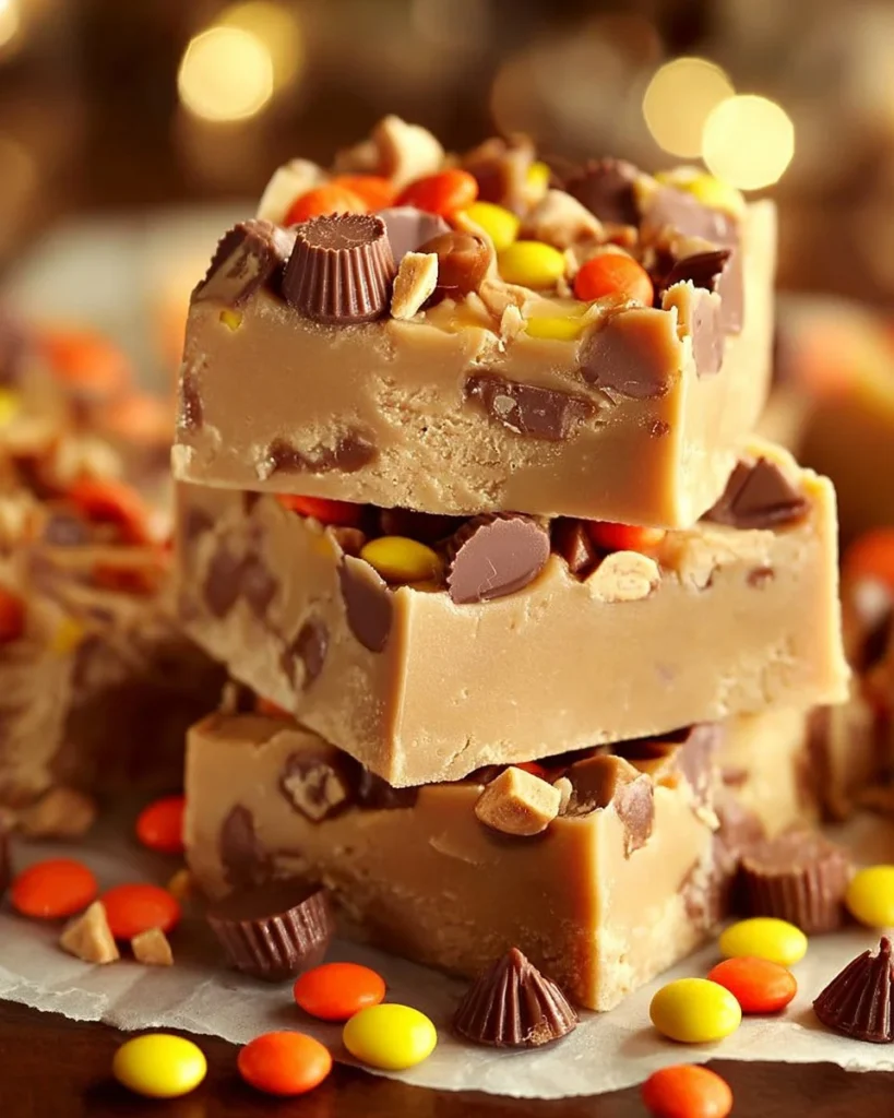 You will love this fudge for many reasons. It comes together fast, in one pot. The texture is creamy and not grainy when you follow the steps. The peanut butter gives a deep nutty taste, and the white chocolate adds a mild sweet base. You get crunchy bits from chopped peanut butter cups and bright color from Reeses Pieces on top.