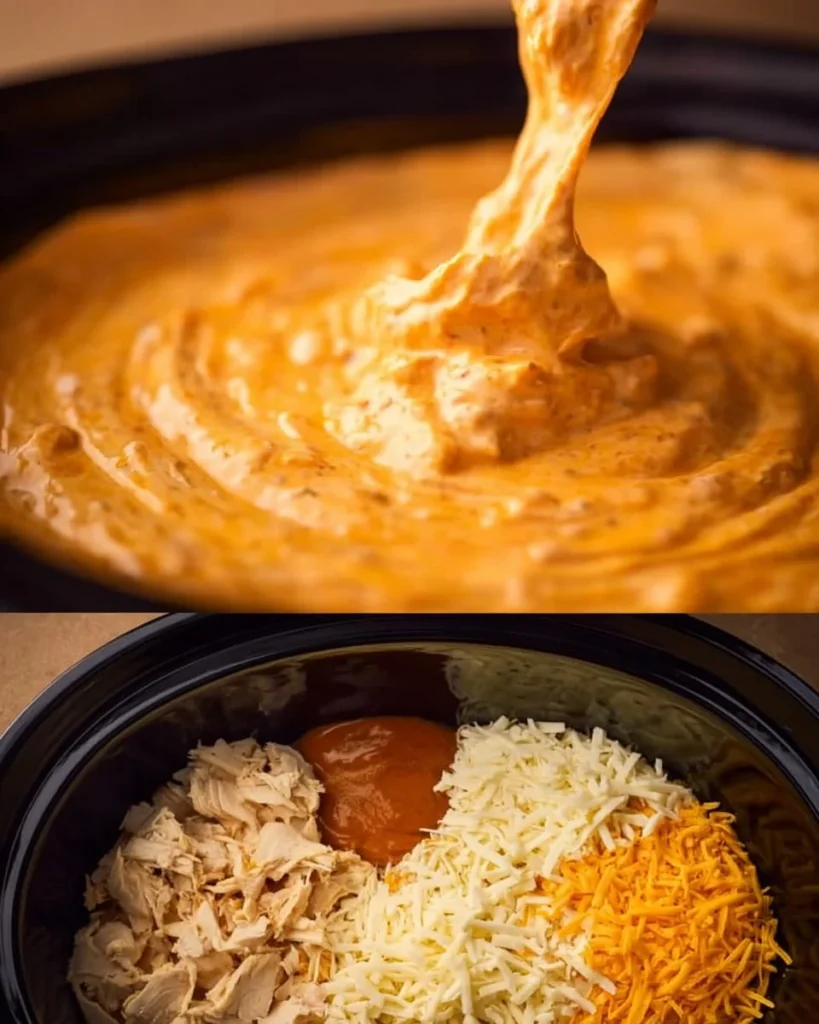 This dip cooks slowly and becomes smooth and saucy. First, gather the ingredients and the equipment. Then, add the chicken and sauce to the crockpot. Mix in the cream cheese, ranch, and cheddar. Let it heat gently until the cheese melts and the dip looks creamy. Stir once or twice while it cooks. Taste and add more buffalo sauce if you want more heat. Serve it warm with chips or vegetables.