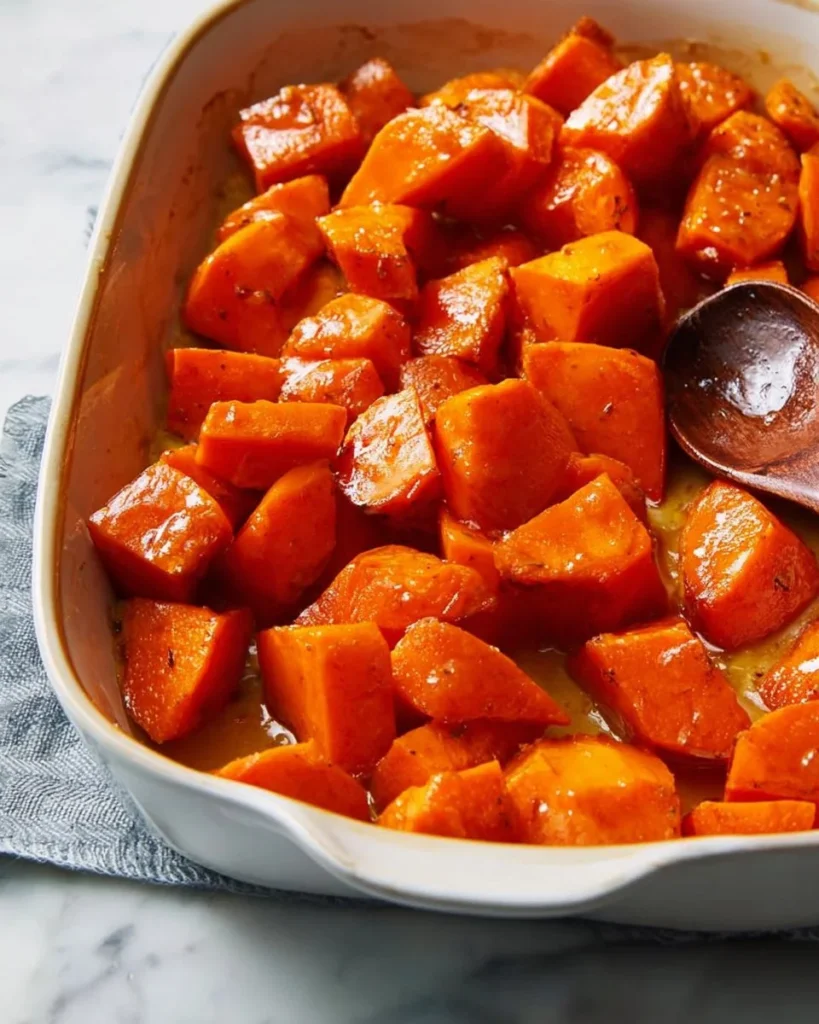 Store leftover candied yams in an airtight container in the fridge for up to 4 days. Reheat in a warm oven (about 325°F) for 10–15 minutes or microwave in short bursts until hot. For longer storage, cool fully, place in freezer-safe containers, and freeze for up to 3 months. Thaw overnight in the fridge before reheating. Freezing may change the texture slightly, but the flavor holds well. This makes the dish great for meal prep and a good choice if you like to cook ahead.
