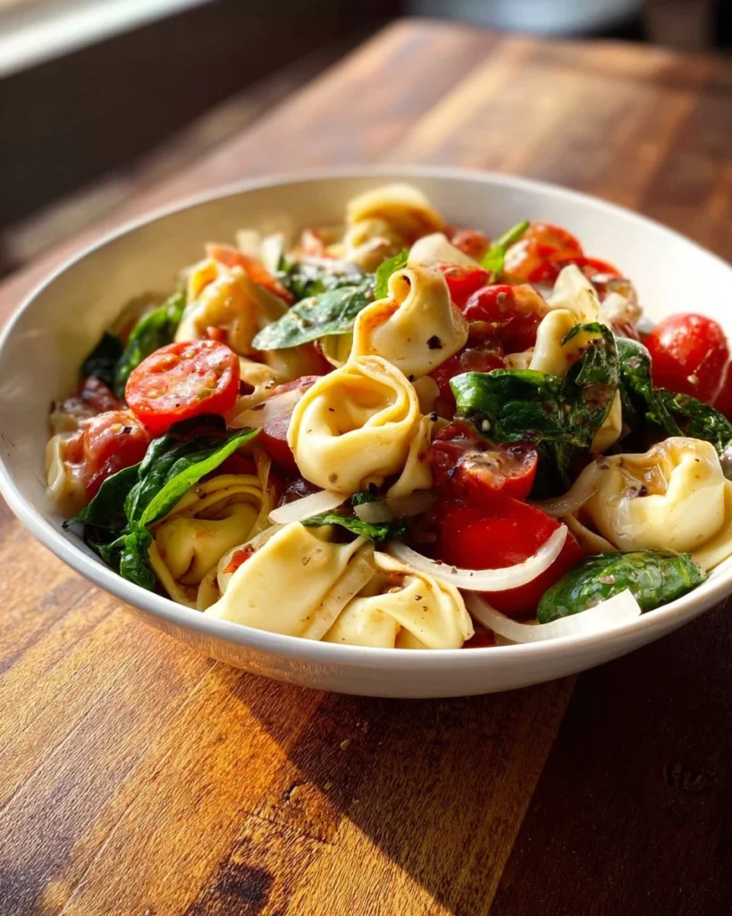 Healthier version: Use whole grain or a lower-calorie vegan tortellini and cut the olive oil to 1 tablespoon. Add extra vegetables like cucumber and spinach for more fiber. This version is a healthy version for people who want more nutrients and fewer calories.